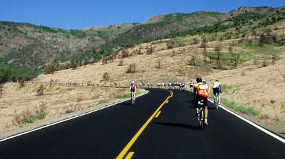 | The road from Ebbetts down to Hermit Valley and then back up to Ebbetts for the fourth pass is the shortest of all the climbs. Only 5.3 miles each way, and 1600ft. However, the road is potholed and windy. Some of the potholes are the same color as the road surface and thus invisible at speed. While climbing back out from Hermit Valley the uphill riders would often shout a warning of "pothole" then, bam! the downhill rider would slam into it. On my downhill I swear I hit the same one as two years ago, it was totally invisible. On my way up I saw another five riders slam into it. Fortunately I didn't see anyone wreck or flat from it. |