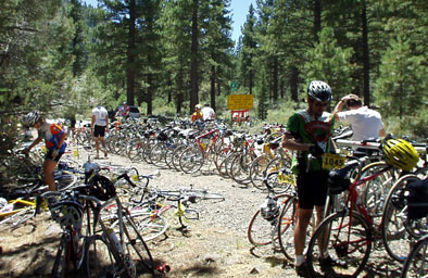 I left the top of Ebbetts, at around 12:30pm, an hour faster than last time. The ride to lunch was an enjoyable downhill. Lunch was at the 80 mile marker. Following my sandwich and vegetable soup it was on through Markleeville, and past the start line at Turtle Rock Park to get to Woodfords. The "parking" at lunch looks like a bike junk yard with literally hundreds of bikes leaning against every tree available and still hundreds more just laying on the ground.. |