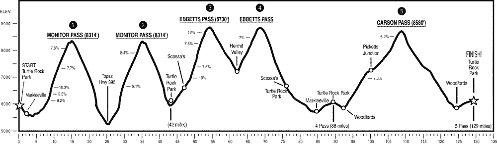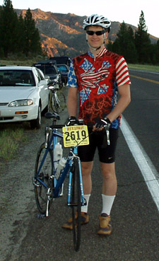 both in the six weeks prior to the event. The Sierra Double Metric Century, and another Double Metric had put me in position to meet the training goals. Starting in the Sacramento Valley area there's not much around that can prepare you for the high altitude of the Death Ride, so it's just a matter of training hard and doing lots of hills. The highest climb I've been to since the 2001 Death Ride was 4700ft on the Sierra Century. The Death Ride starts at 6100ft and fluctuates between 5500ft and 8700ft. Bike Setup Standard Ultegra Triple 52/42/30, and a 12-27 rear cassette. Two cycle computers. One measuring RPM, Current Gear, and Speed, the other primarily Altitude, Power, Ascent Rate, and Speed. Two water bottles, there's no need for a camel back as the ride is so superbly supported. |